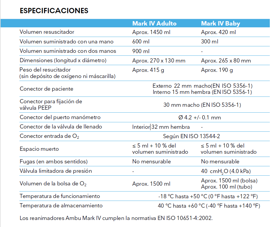 Los Ambu® Mark IV son reanimadores reutilizables diseñados para la ventilación manual de pacientes adultos, pediátricos y neonatos. Están disponibles en dos tamaños; Baby - adecuado para pacientes con un peso corporal de hasta 20 kg, y Adulto - adecuado para pacientes con un peso corporal de a partir de 15 kg.